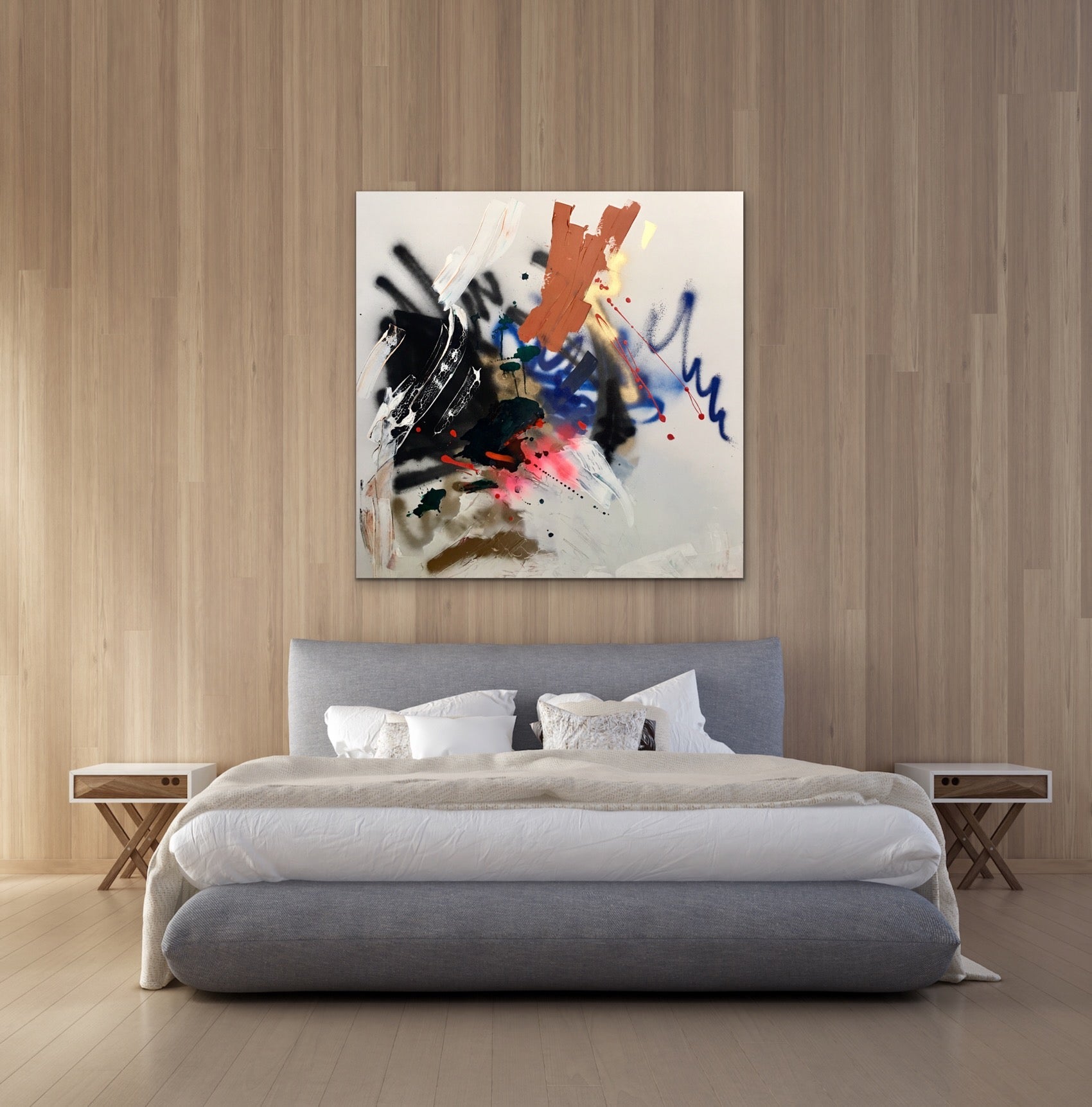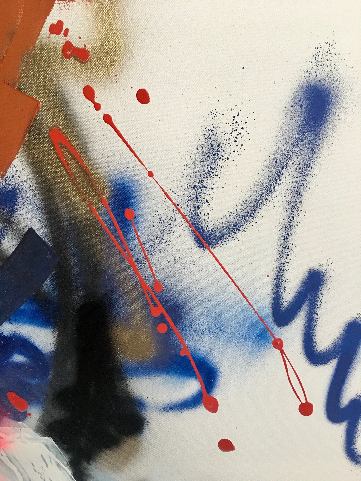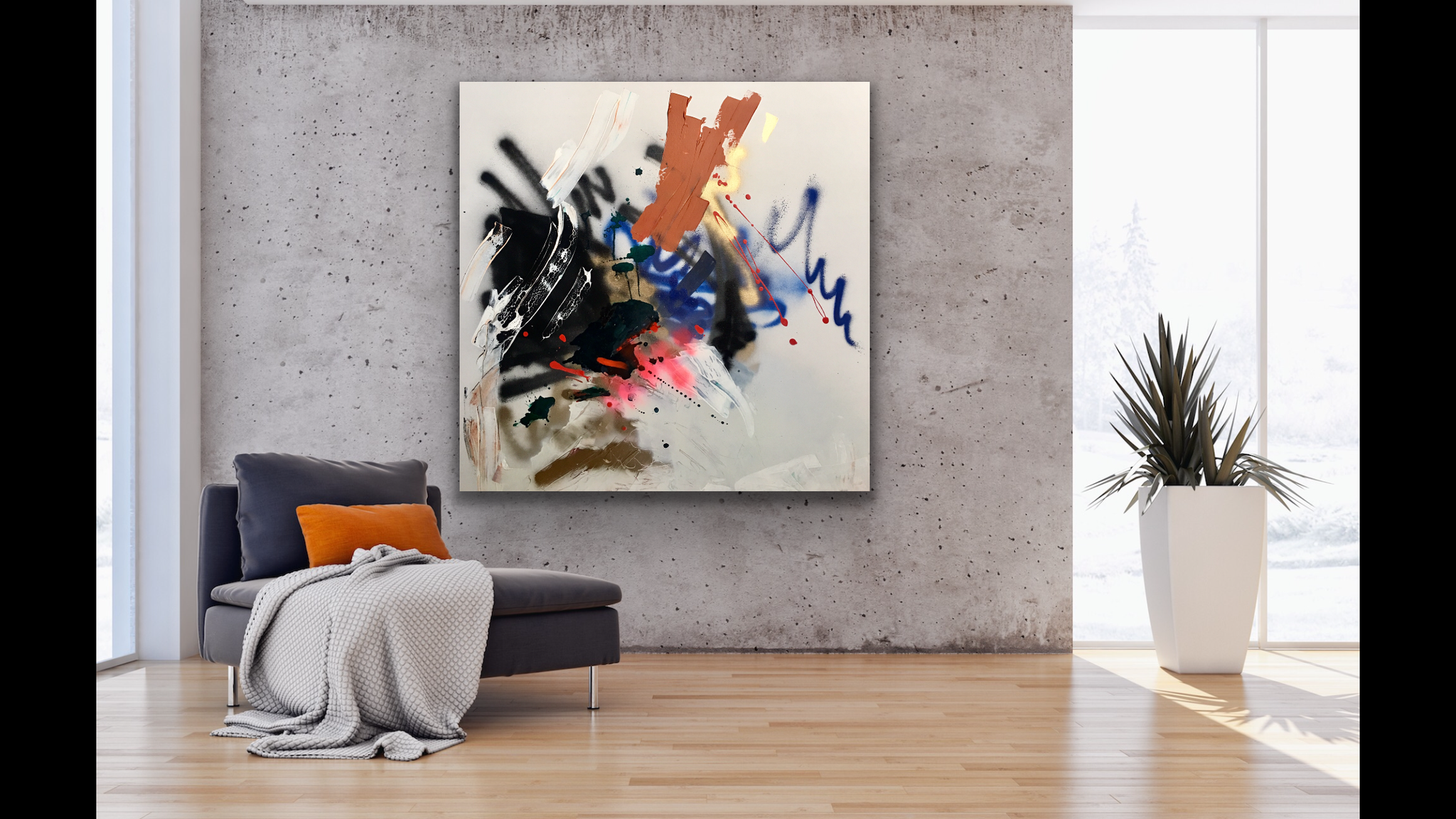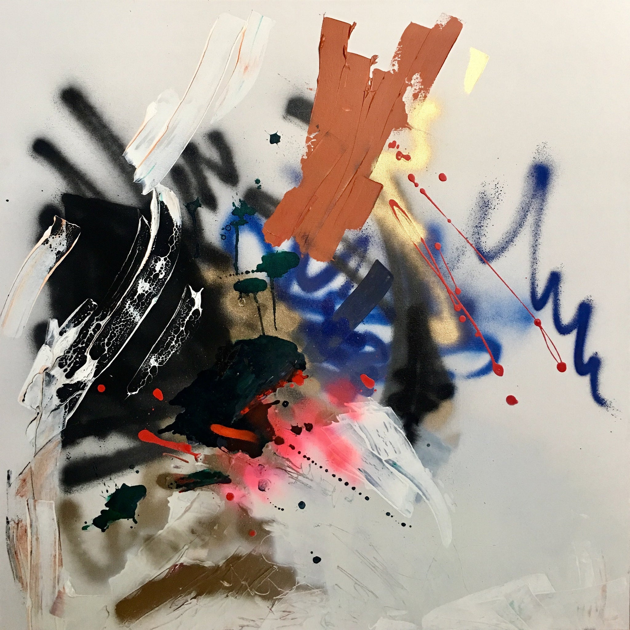 36x36 inches. Original Acrylic, Ink and Spray paint on Gallery wrapped canvas, 1.5 inch depth edges.