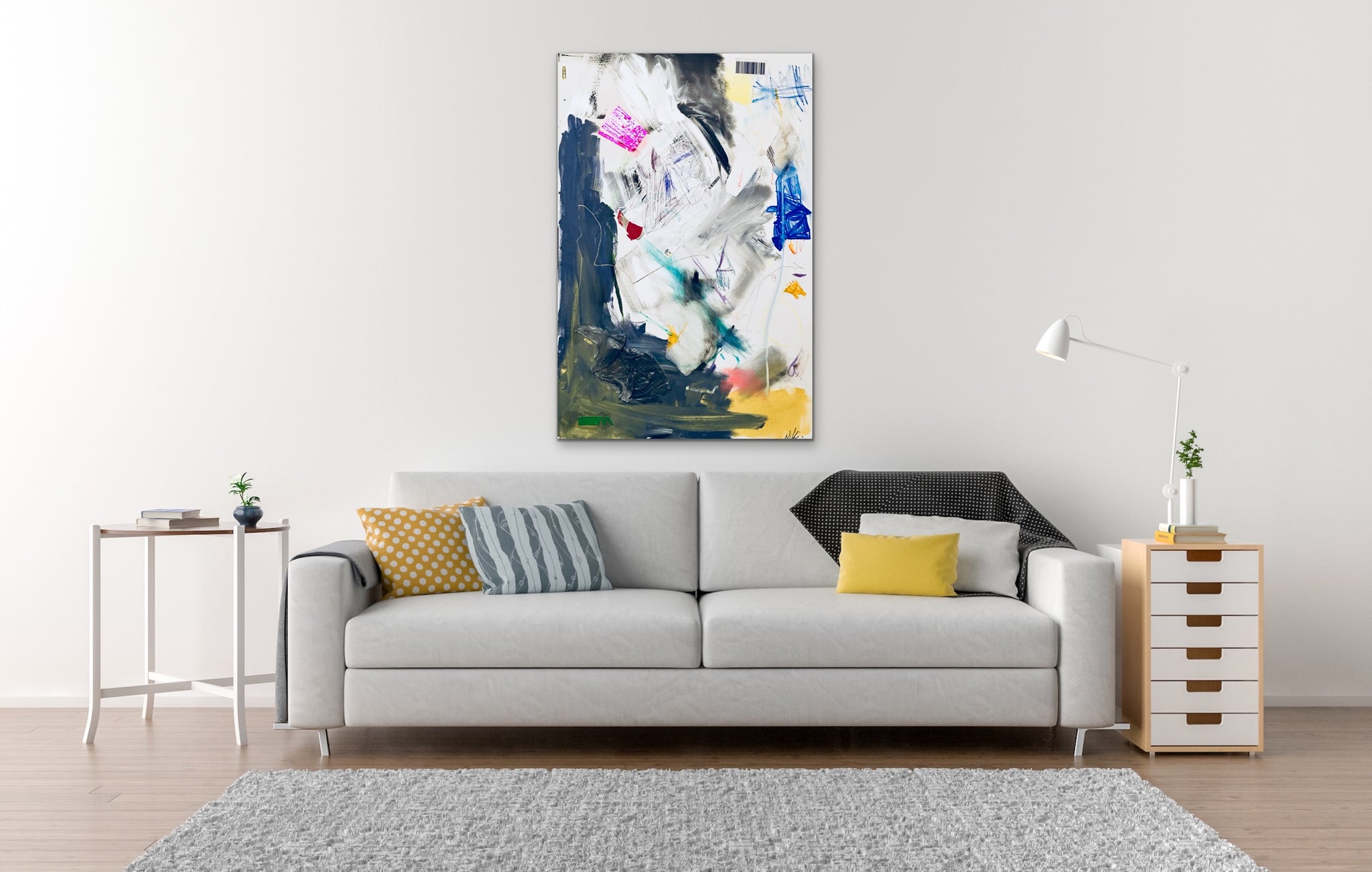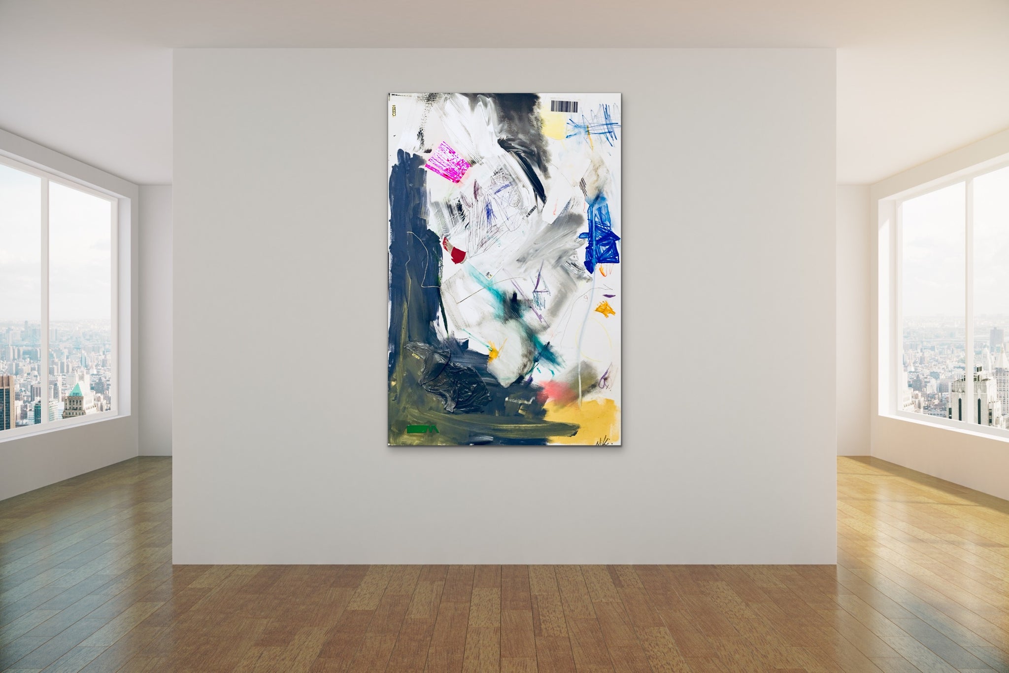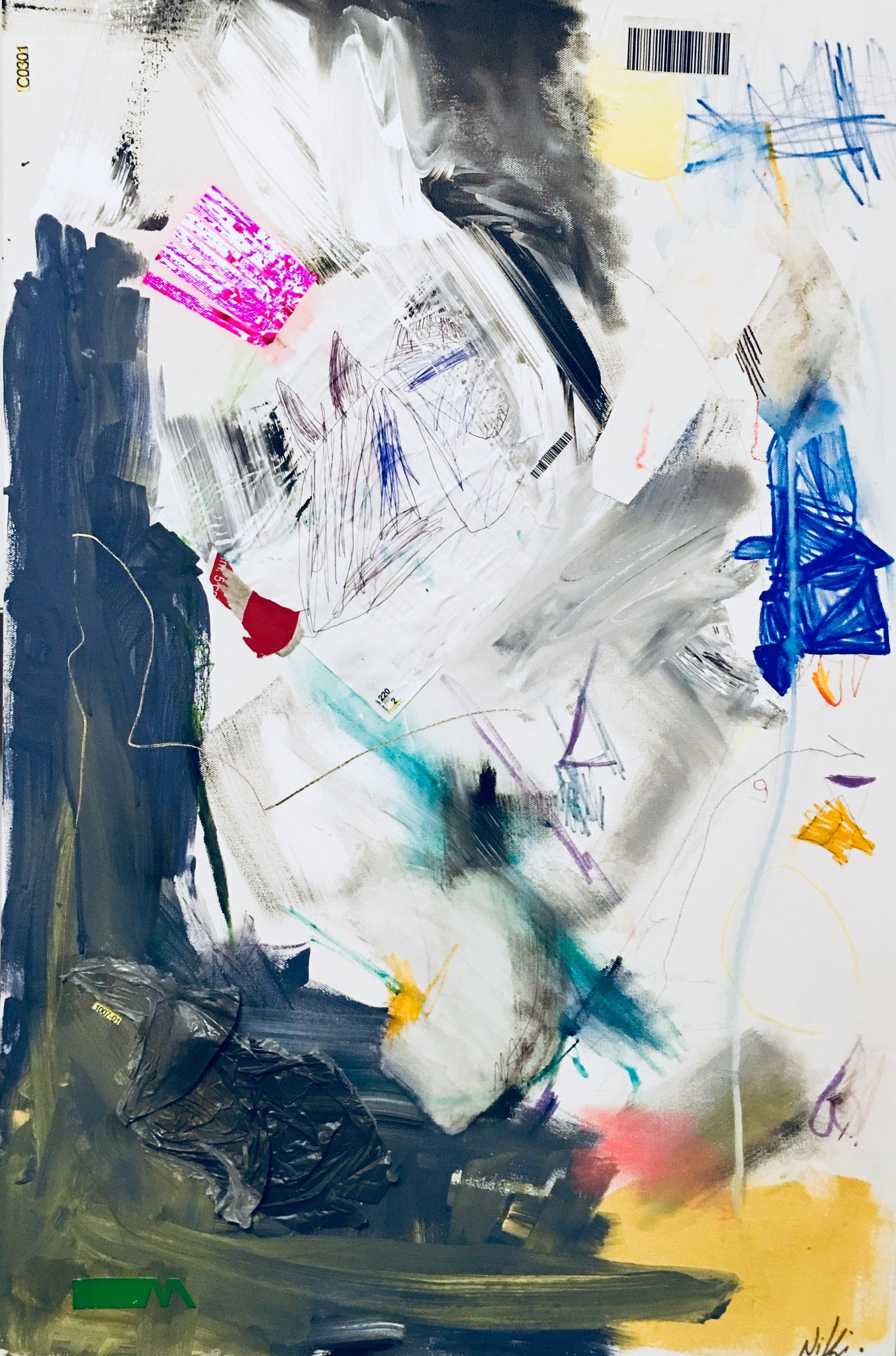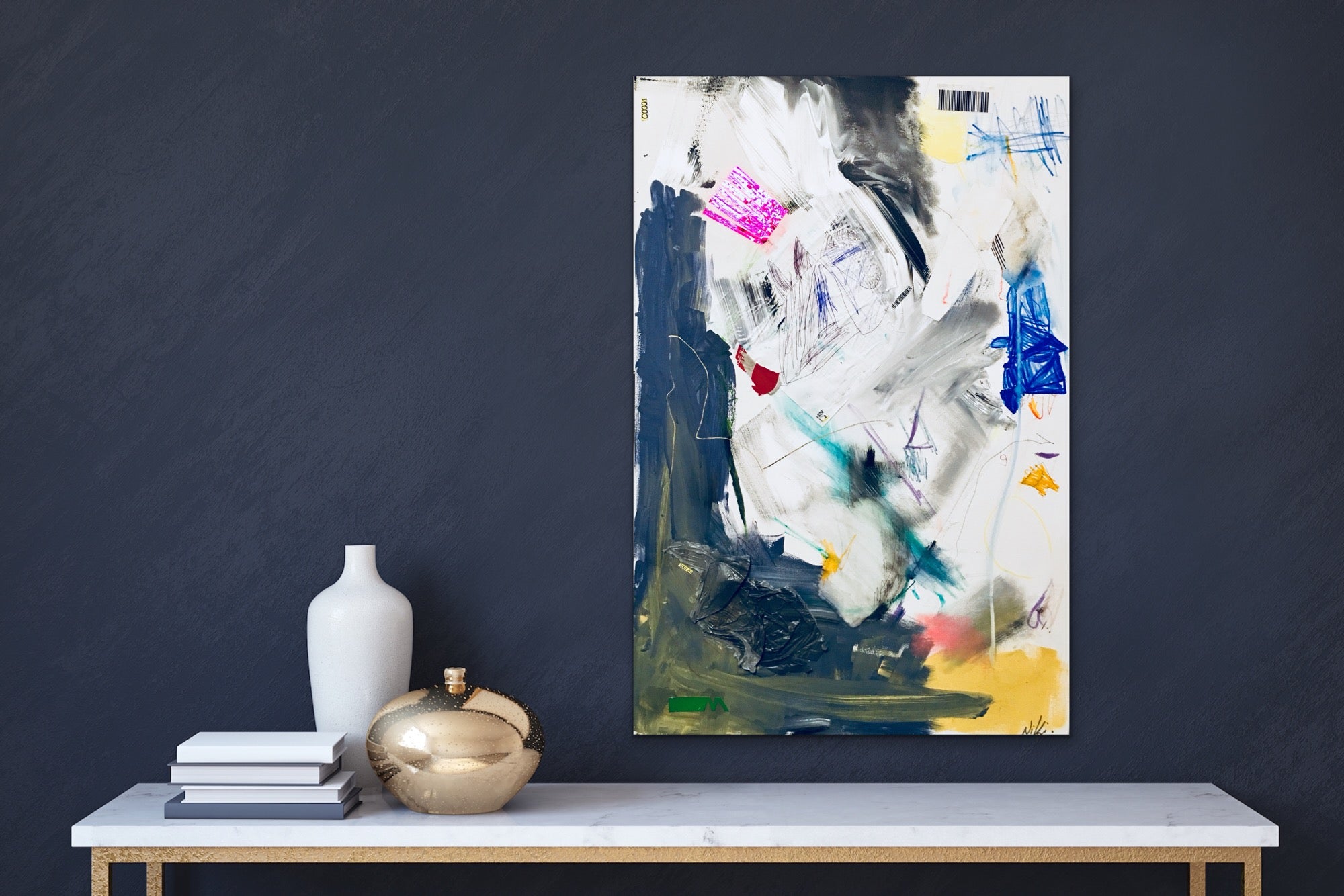 24x36 inches. Original, bold mixed media abstract piece with acrylic, pen, pencil, marker, chalk, found objects with a glossy resin finish on canvas. 1.5 inch depth edges.