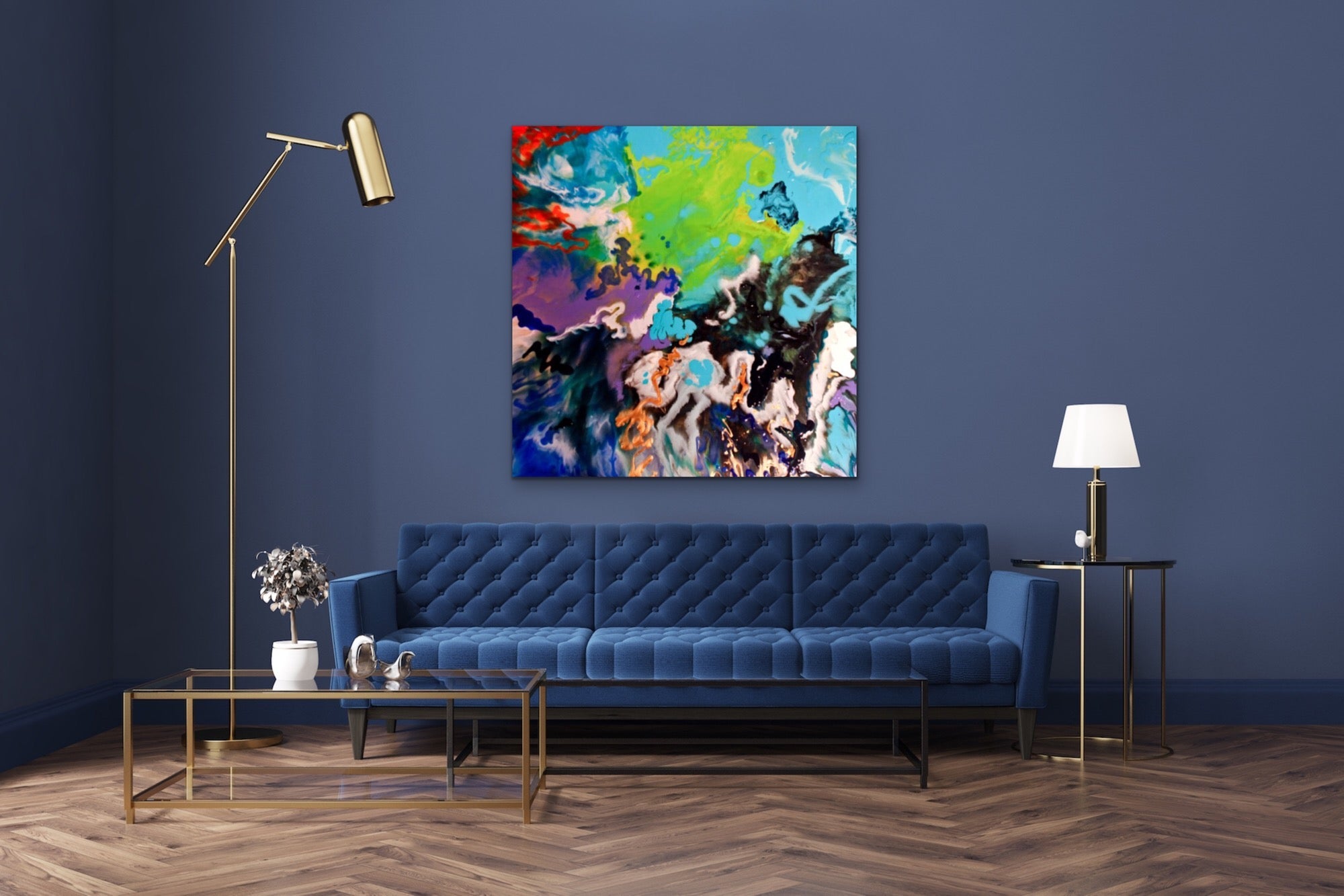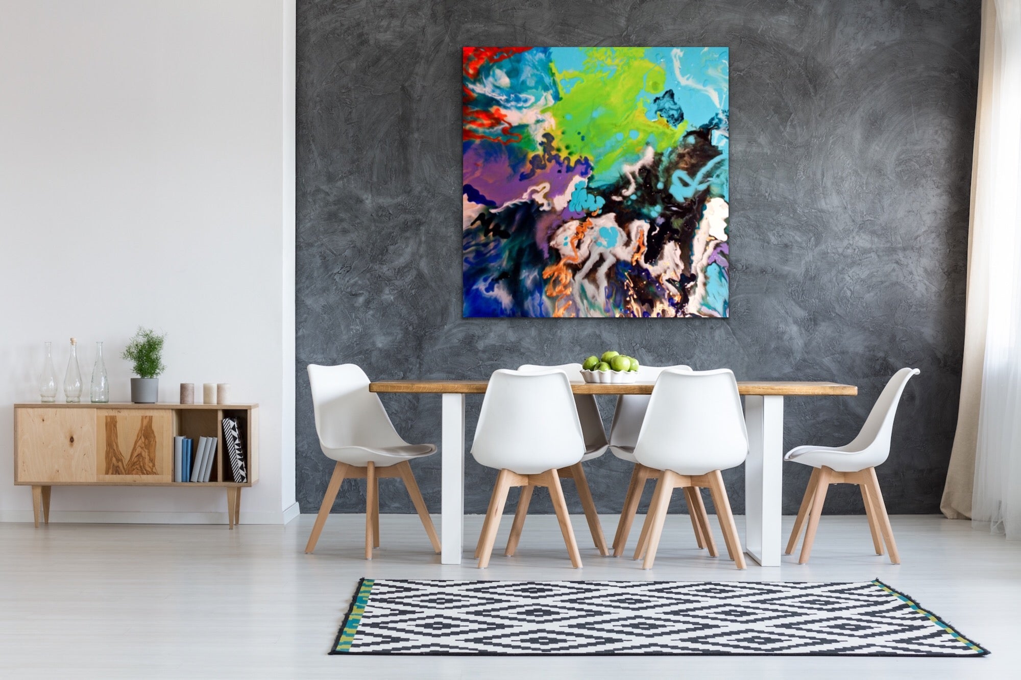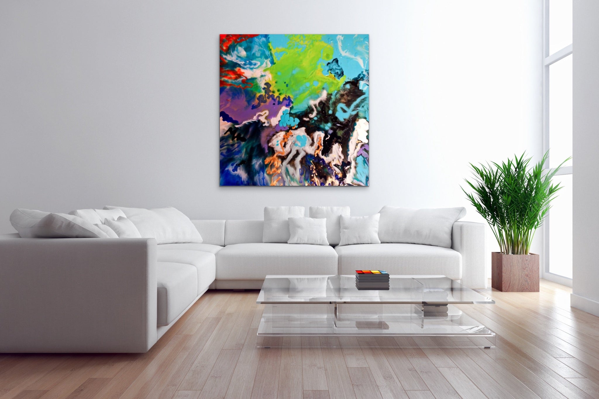 36x36 inches. Original Acrylic, Ink and Pouring Medium on birch panel, 1.5 inch depth edges. Raised layers, with glass like appearance.