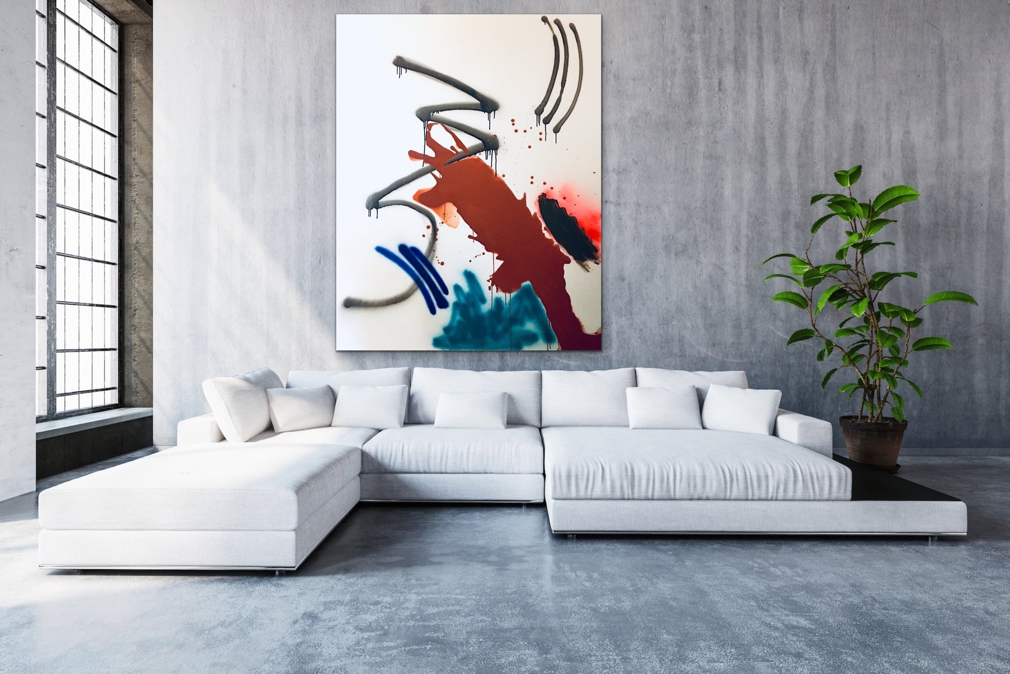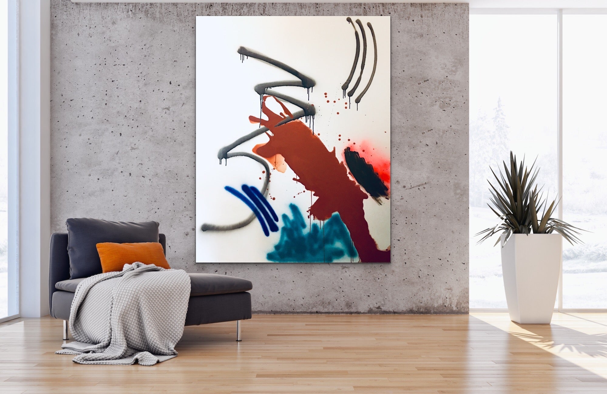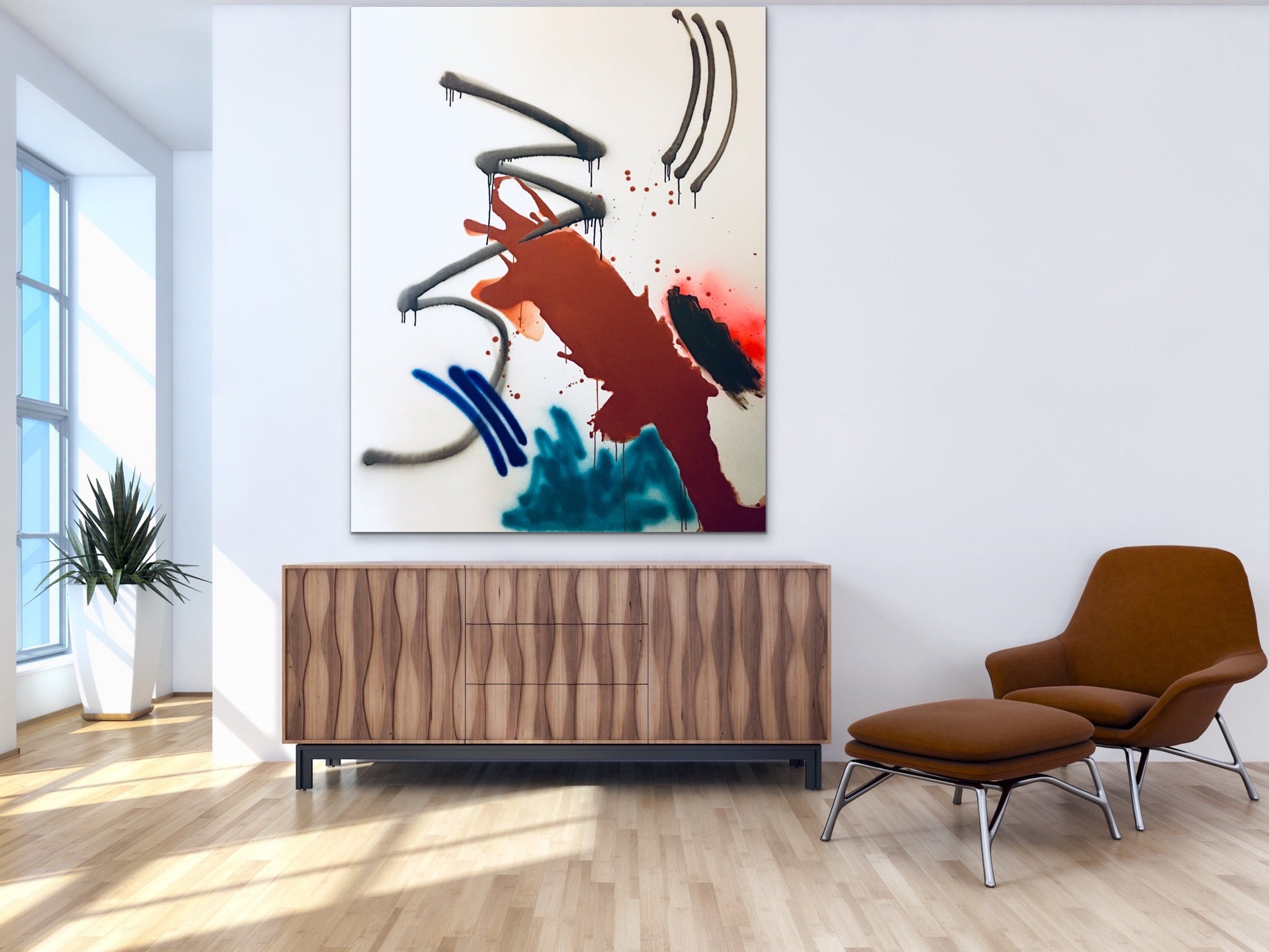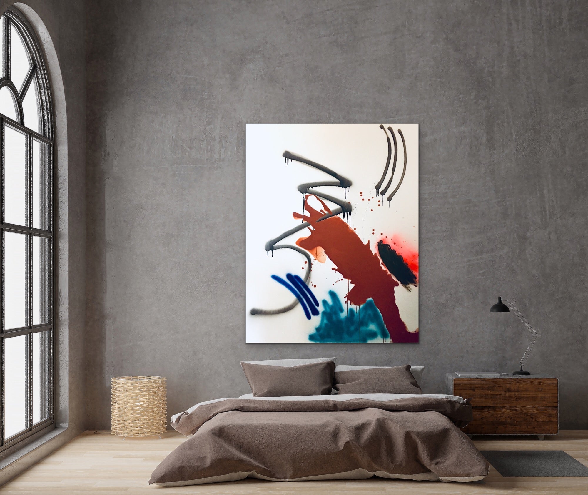 48x60 inches. Original Minimalistic Acrylic, Household and Spray paint on Canvas, 1.5 inch depth edges. Painting comes wired, ready to hang. Signed, titled and dated on back. All artwork comes with a certificate of authenticity. **Ships in a wooden crate. Please allow extra time for shipping, once crate has been shipped. This item usually ships within 11-14 business days. Delivery time will vary depending on destination. Shipping included on original art.