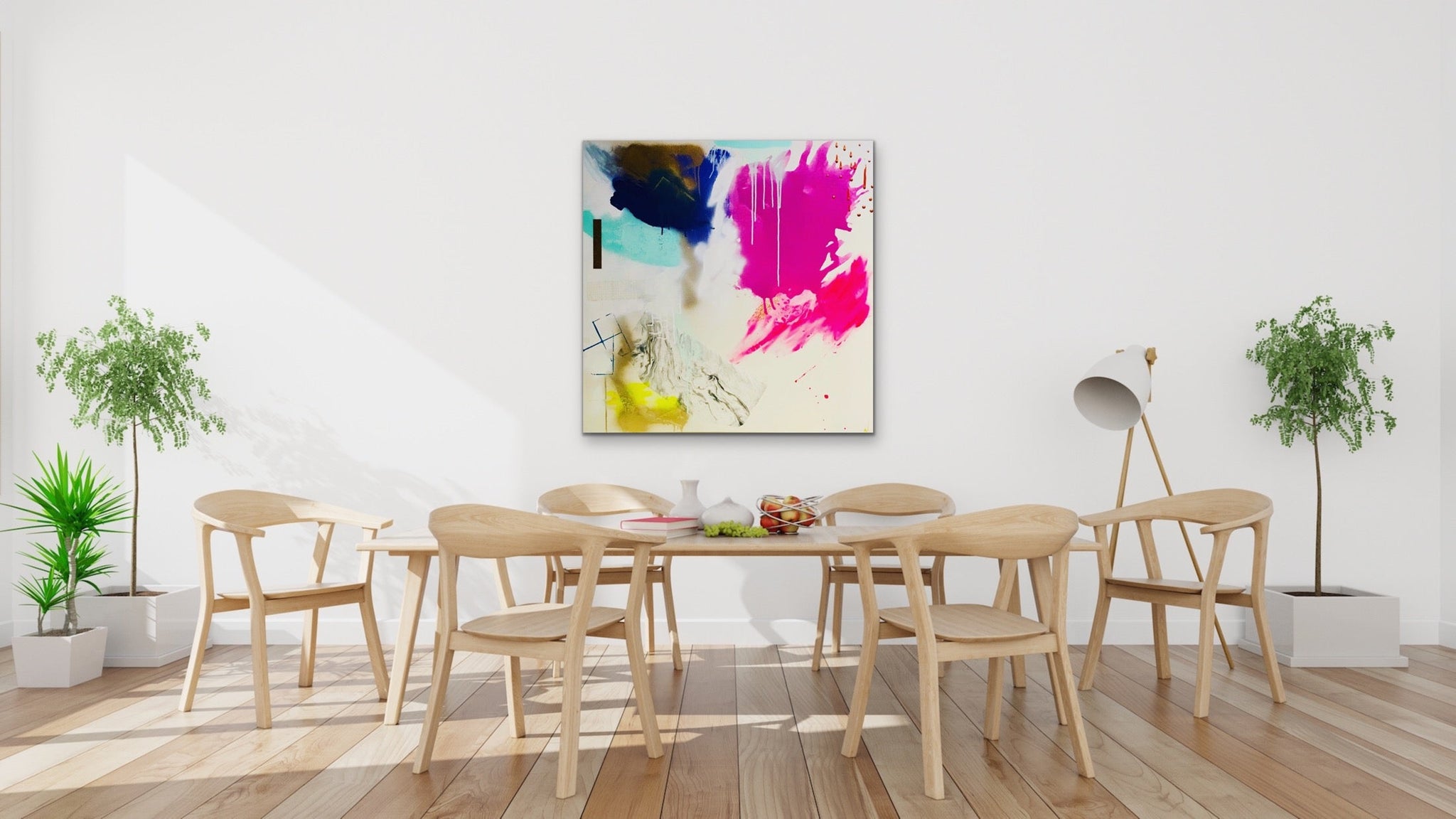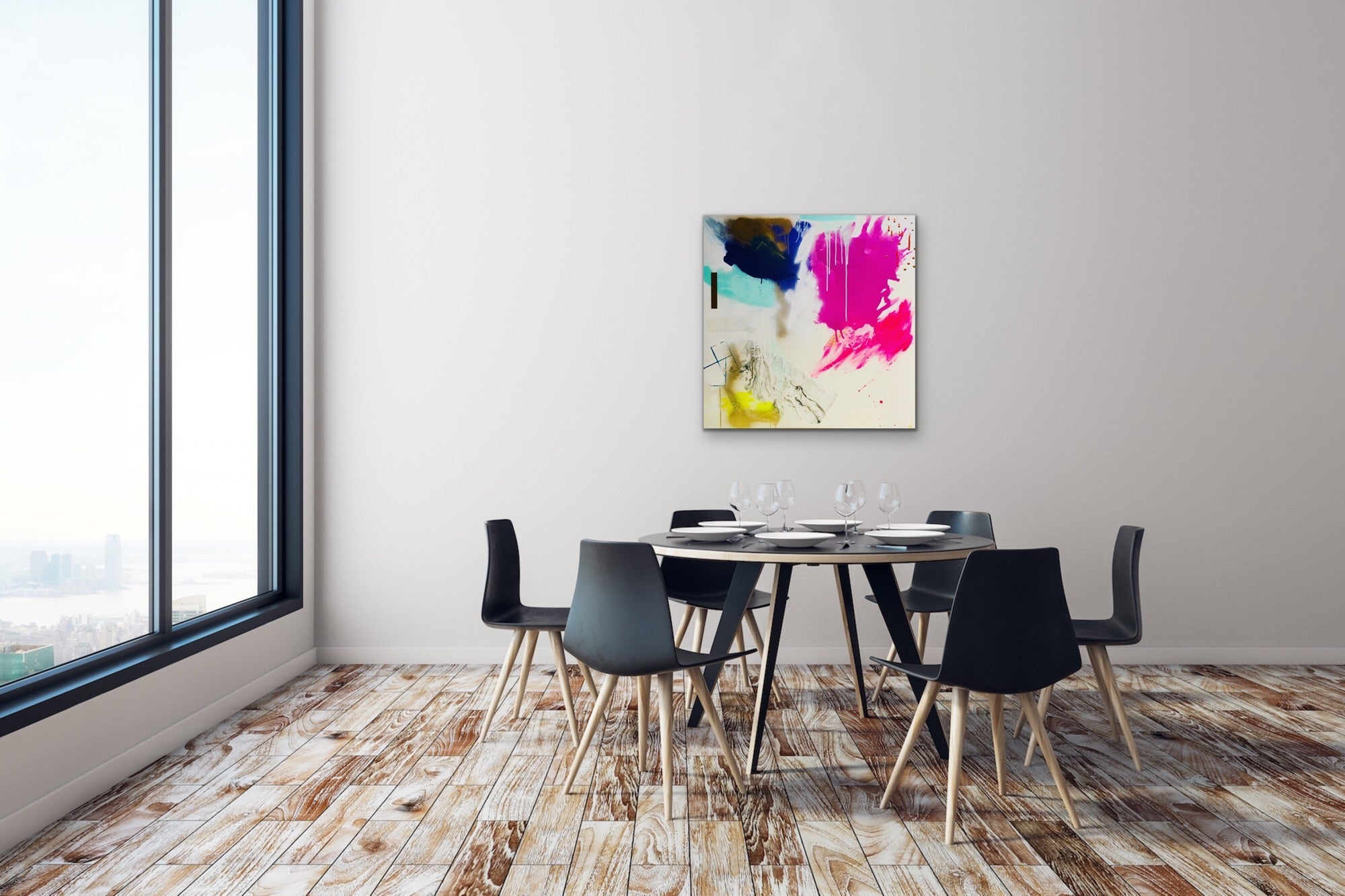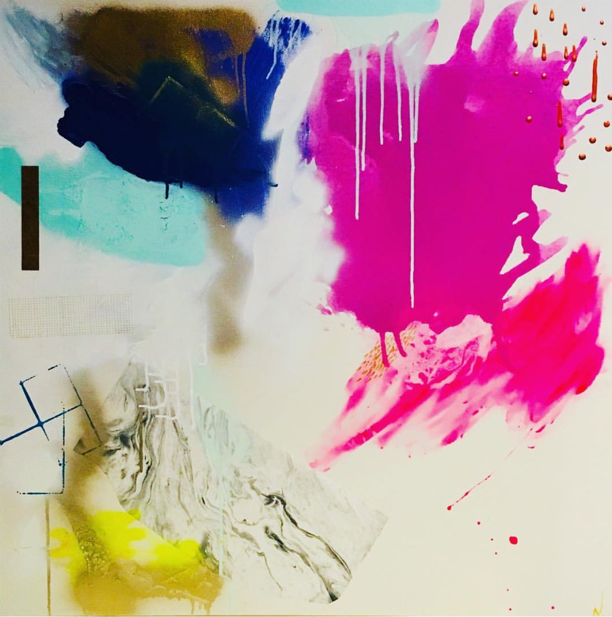 30x30 inches. Original acrylic, marker, found objects, spray and resin finish on gallery wrapped canvas.